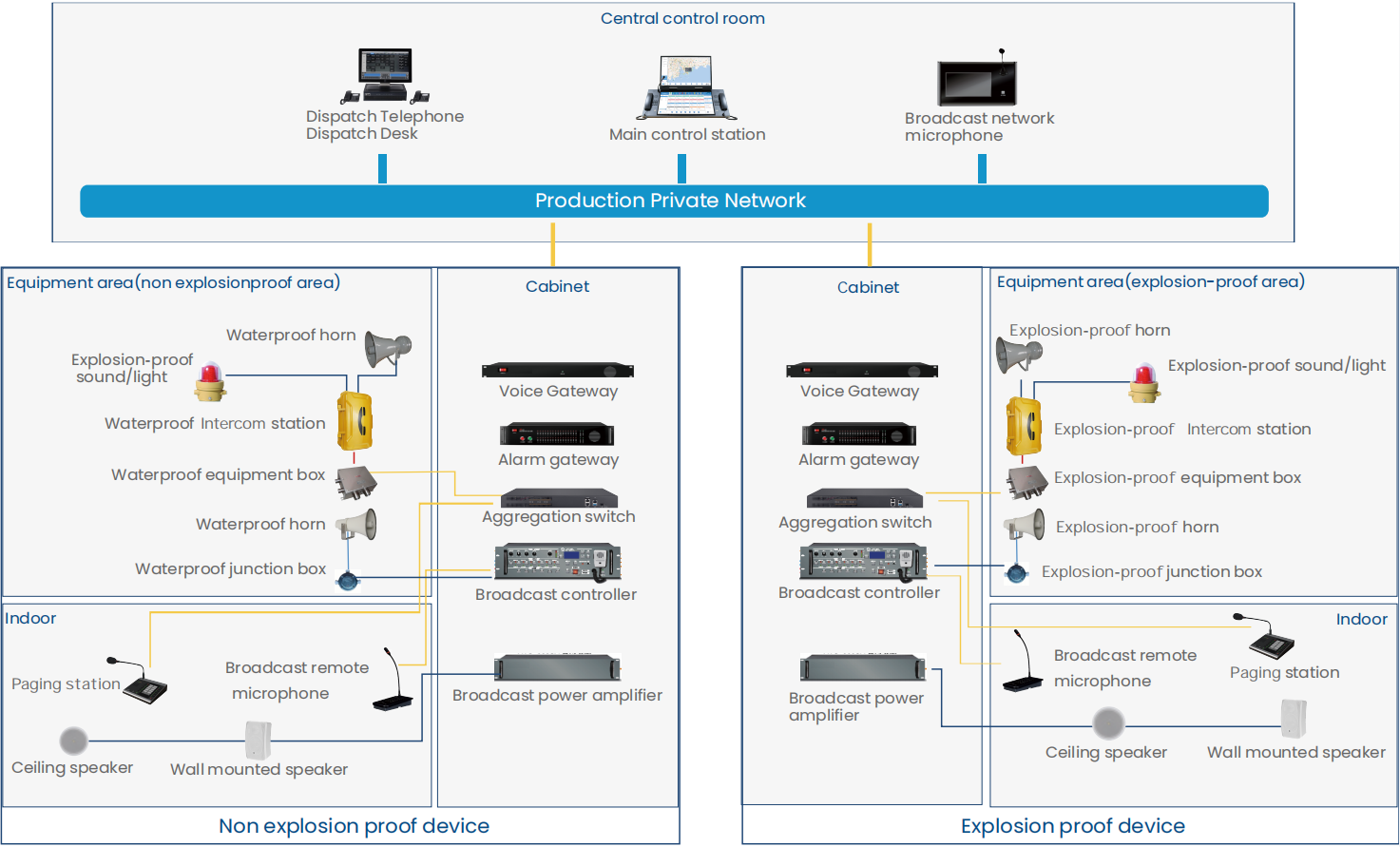 Based on the concept of " AI + safety production", via IP network broadcasting, 5G, AI voice and IOT technologies, It establishes a unified platform that integrates fire safety, emergency response, public address, tele-broadcasting, and intercom functionalities. The system centralizes management and intelligent orchestration of daily notifications, production dispatching, emergency command, and security warnings in petrochemical parks, driving enhanced safety prevention and operational performance.